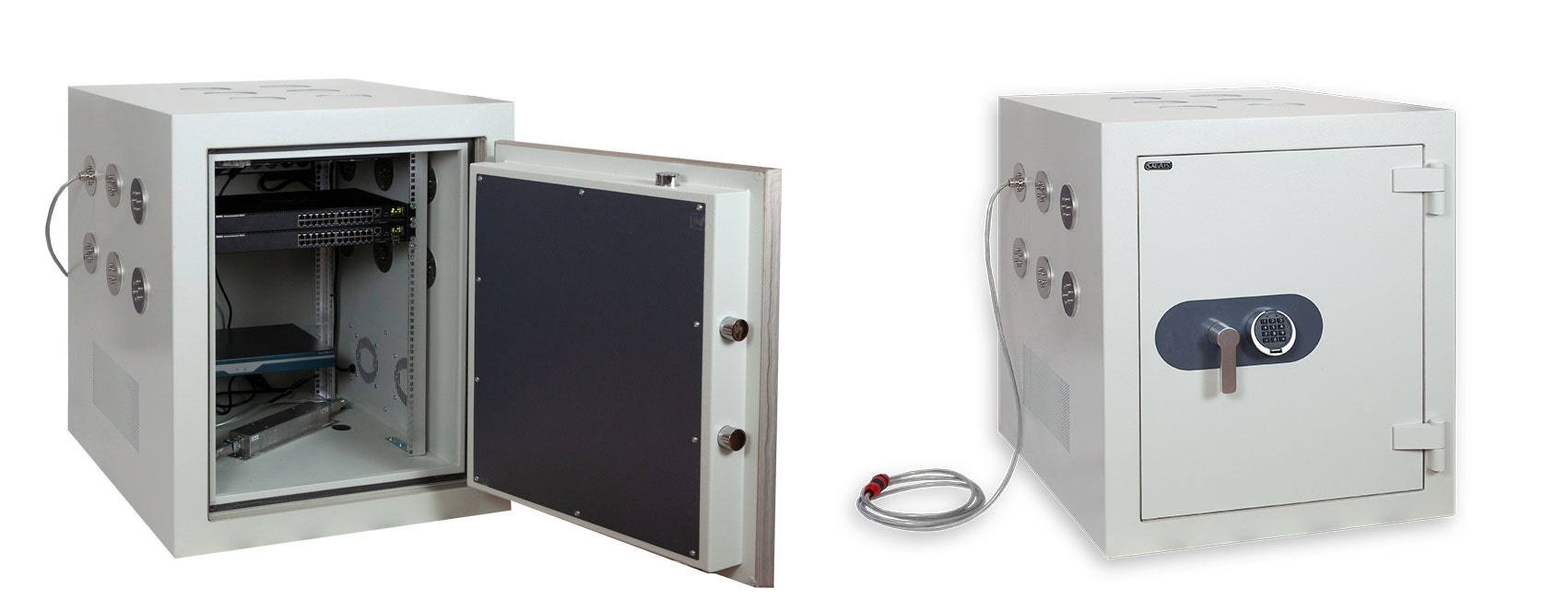 The Salvus server safe offers secure storage for all your servers and IT equipment. The safes are available in various burglary protection levels and can also be supplied in the tempest version. Electronic equipment emit electromagnetic waves. When data is processed in this equipment, there is a risk that it can be intercepted by means of the emitted electromagnetic signals. This phenomenon, compromising radiation, and the measures that can be taken to minimise the risk, are called ‘TEMPEST’. The Salvus server safe in the tempest version is completely protected by various protective filters and materials (optional). Salvus server safe Salvus server safe with tempest The Salvus server safe can be fitted with shelves and electronic or biometric locks. If you would like to find out more about this special server safe, feel free to get in touch with us. Our specialists will be happy to explain all the options, no obligation.