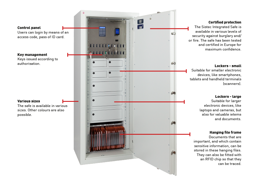 The Sistec 19” integrated safe is a secure issue point for electronic devices, important keys and sensitive information. Where companies make use of expensive electronic equipment, like handheld terminals, laptops and smartphones, there is a risk of theft and fraud, but simply forgetting to return equipment, important keys and documents containing sensitive information can cause unnecessary worry as well. The Sistec 19” integrated safe is a solution for organisations which want to protect electronic devices, important keys and documents from theft and/or fire, while at the same controlling their issue and receipt, so that there is a complete ‘trail’.