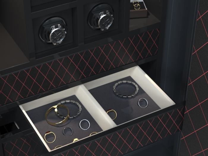 De Salvus horlogekluis is speciaal ontworpen voor het opbergen van kostbaarheden zoals sieraden, horloges en juwelen. U ontwerpt de kluis naar eigen wens met bijvoorbeeld watchwinders en juwelenlades en voor het interieur kunt u kiezen uit onder meer hout, alcantara, leer en gekleurde stiksels.