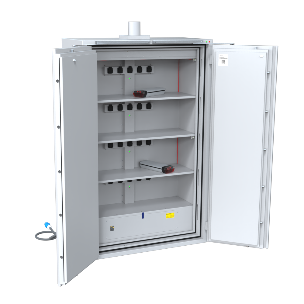 Als fabrikant van gecertificeerde kluizen en brandkasten hebben wij al onze kennis gebruikt om een veilige accukluis te ontwikkelen waarin lithium-ion accu’s veilig kunnen worden opgeborgen én opgeladen. Onze Batteryguard accukluis houdt een accubrand binnenin de kluis en voorkomt dat de brand overslaat naar je pand. Onze accukluis is namelijk een kluis met stevig hang- en sluitwerk en een solide slot op de deur. Hierdoor blijven de deuren dicht bij een accubrand.